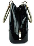 - Fabric interior lining with one zipper pocket on one side and two flat pockets on the other side all trimmed in patent PU