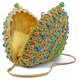 Illustrious silhouette, lavish brilliance, whimsical vibe. This enchanting minaudière in resplendent greens and blues conjures up visions of Belle Époque. For the discerning fashionista who desires to introduce some eccentric energy to her holiday fashion aesthetic.